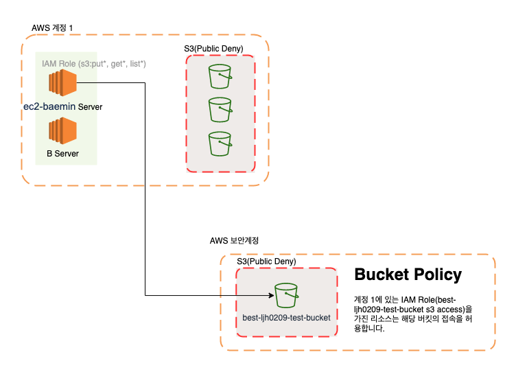 계정 1의 ‘ec2-baemin’ 서버가 보안 계정의 ‘best-ljh-test-bucket’ 버킷에 접근하는 상황을 가정해 보겠습니다. 교차 계정 환경에서 타 계정에 있는 리소스가 접근할 수 있도록 하는 방법은 여러 가지가 있지만, 그중 IAM Role 기반의 버킷 허용 정책을 이용하여 작업을 진행하도록 하겠습니다.