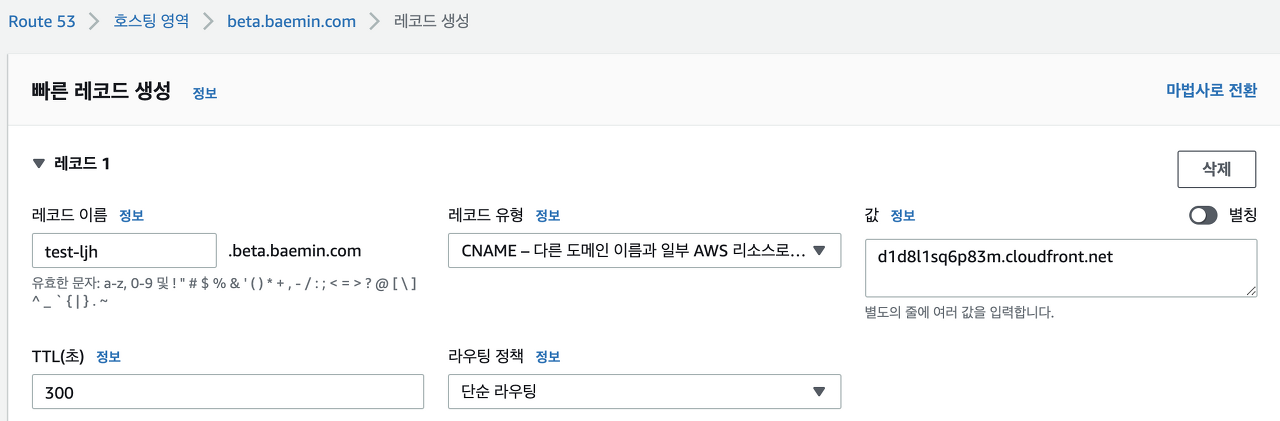 도메인을 연결하기 위해 Route53에서 test-ljh.beta.baemin.com in CNAME 레코드를 지정하였습니다.